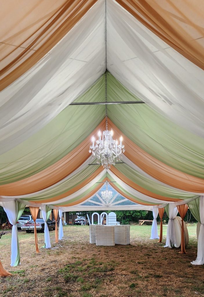 We provide custom tent draping solutions designed to fit your tent size, layout, and event style. Whether you’re looking for full ballroom elegance, a light and airy designer look, or a simple perimeter upgrade, our draping services can be tailored to your vision.